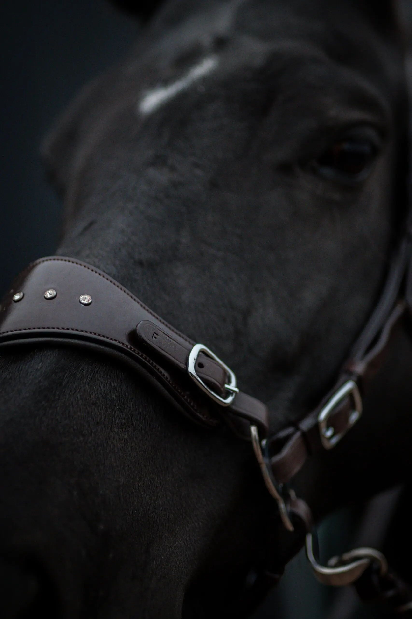 Wyjątkowo elegancki i anatomiczny nachrapnik z kolekcji Adore, wykonany z najwyższej jakości skóry argentyńskiej. Zdobiony subtelnym rzędem lśniących kryształków, łączy luksusowy wygląd z funkcjonalnością bezwędzidłową. Idealnie współgra z czankami typu Hack-Q lub Halo, zapewniając koniowi najwyższy komfort dzięki miękkiemu, owalnemu podszyciu.