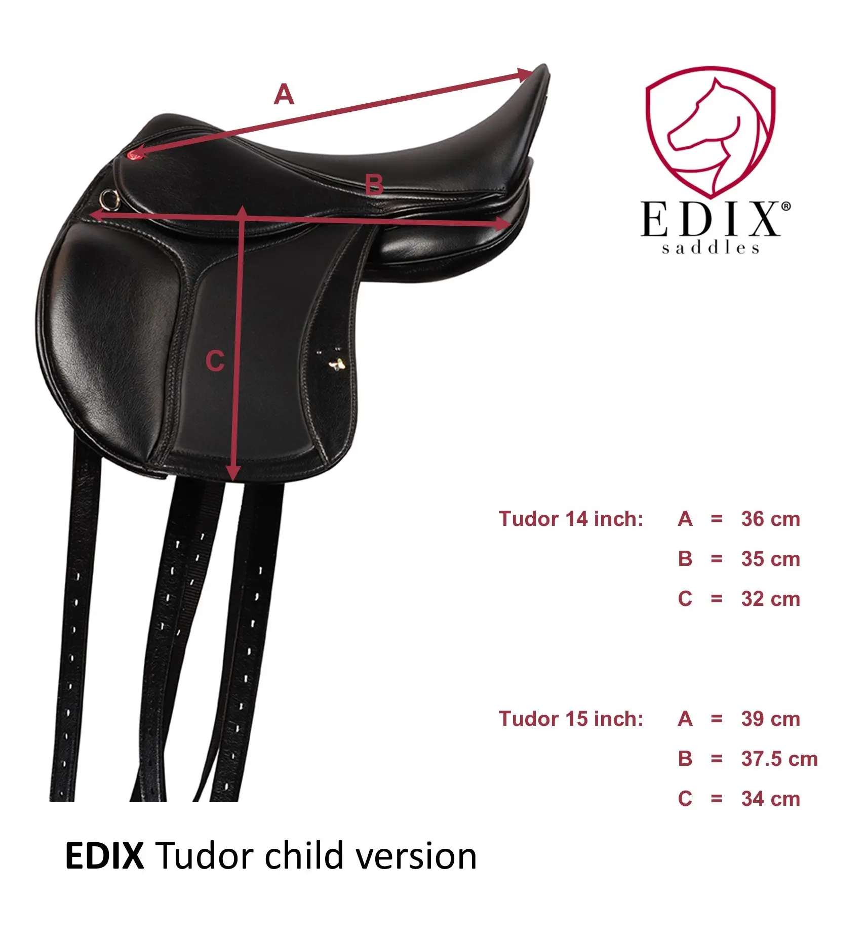 Siodło EDIX Tudor Kids to mniejsza wersja flagowego modelu ujeżdżeniowego EDIX, stworzona z myślą o ambitnych młodych dresażystach. Łączy w sobie tradycyjny, luksusowy wygląd z nowoczesną technologią EDIX Soft Tree. Wykonane z najwyższej jakości, miękkiej i przyczepnej skóry cielęcej, zapewnia wyjątkowy komfort, stabilność oraz niezwykle bliski kontakt z koniem (close contact).