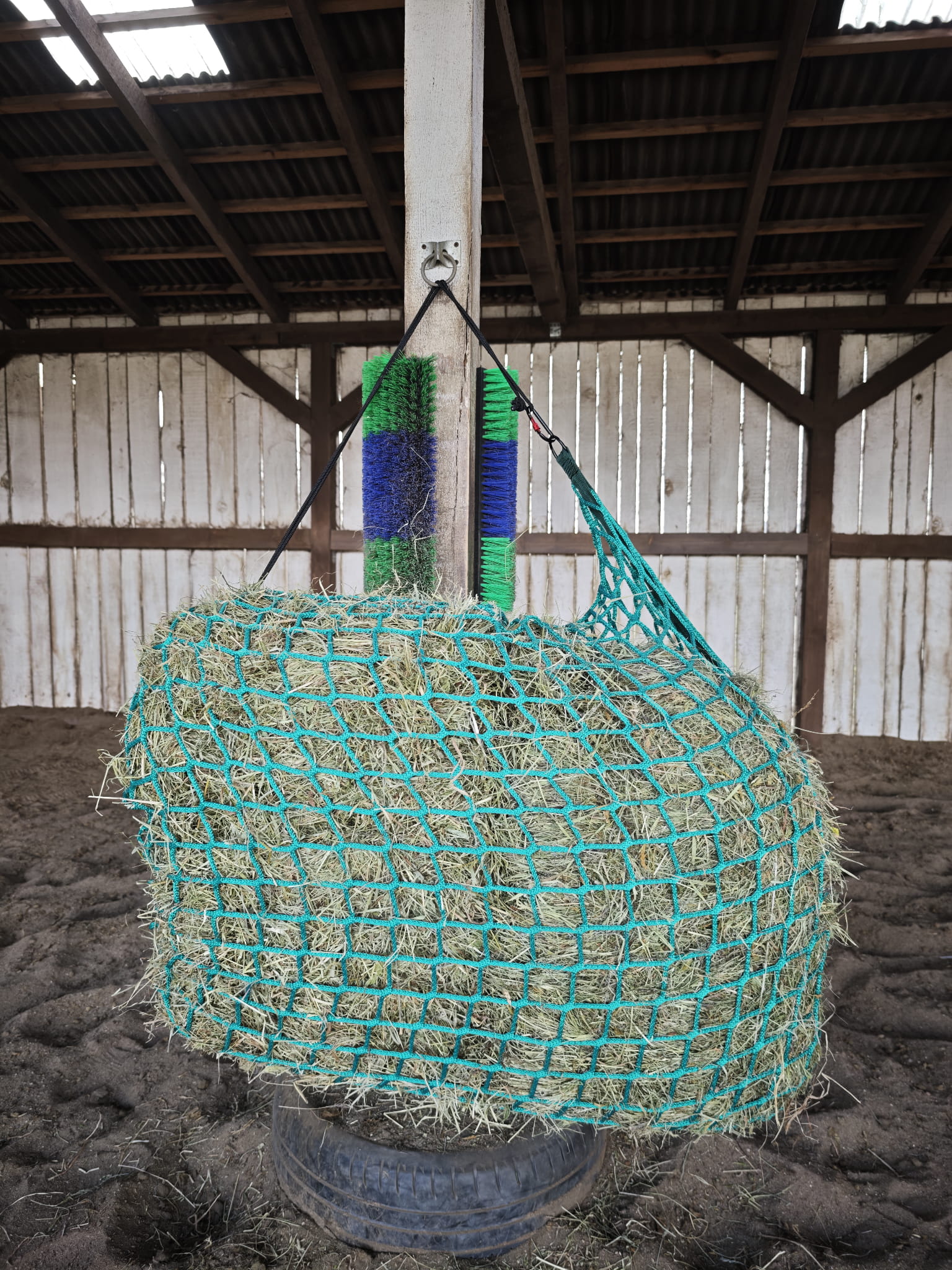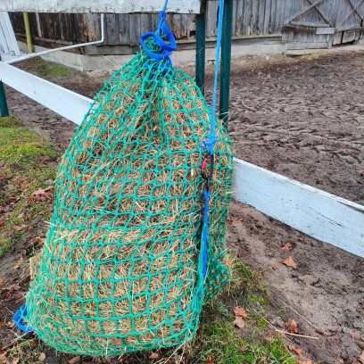- Bezpieczna przędza bezwęzłowa: Materiał jest gładki i miękki, co chroni delikatne chrapy konia przed otarciami, nawet przy intensywnym skubaniu siana.